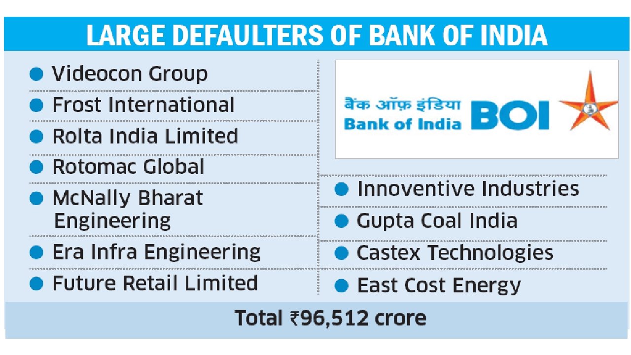 Other large defaulters of Bank of India are Mumbai-based Future Retail Limited (INR2,024 crore), Innoventive Industries (INR1,380 crore), Nagpur-based Gupta Coal India (INR1,370 crore), Delhi-based Castex Technologies (INR1,270 crore) and Hyderabad-based East Cost Energy (INR1,242 crore).